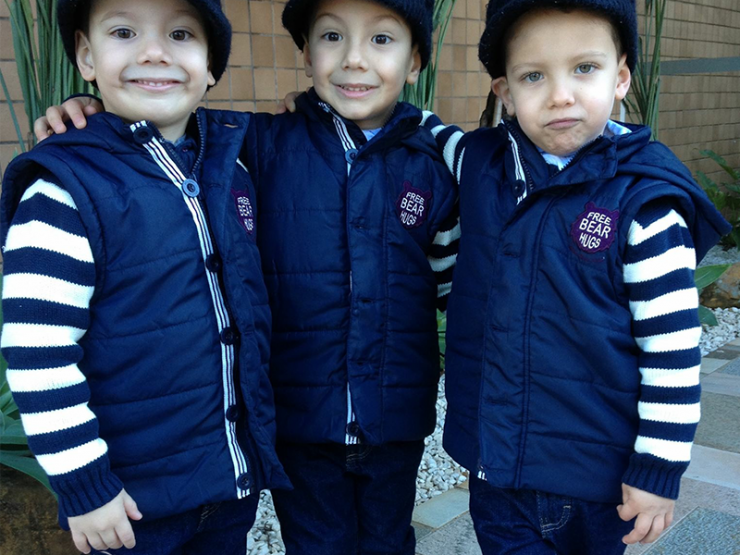 No segundo look, o clássico tom de azul-marinho ganha destaque. O casaco de tricot (ref.: 7513) deixa os petits aquecidos para as temperaturas baixas da estação. O zíper adiciona praticidade à peça. O bordado na altura do peito é um charme à parte no modelo. Complete o look com calça (ref.: 7531) em sarja com cinto + tênis (ref.: M1681) em couro ecológico.